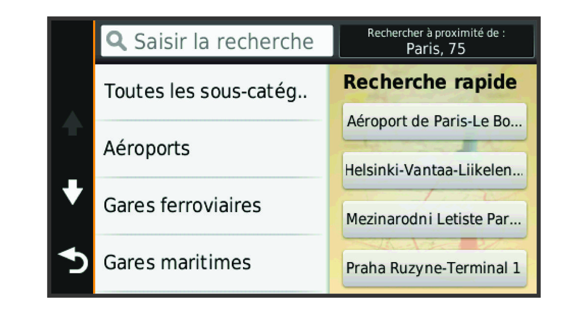 Une fois la recherche d'un point d'intérêt effectuée, certaines catégories peuvent afficher une liste de Recherche rapide qui renvoie les quatre destinations dernièrement sélectionnées.