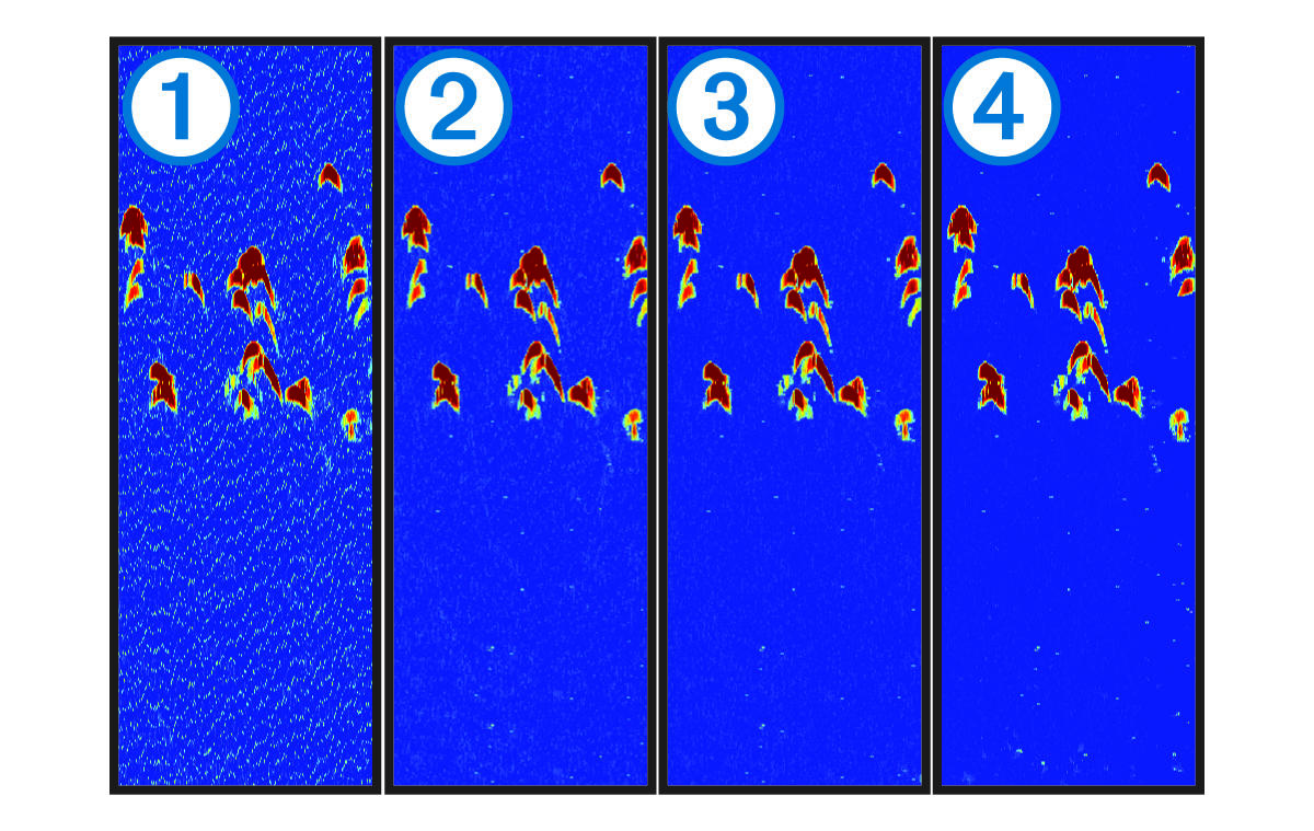 , le bruit s'efface graduellement, mais il y a peu d'effet sur les signaux de cible forts. Pour supprimer les interférences à l'écran, utilisez le paramètre d'interférence le plus bas qui vous satisfait. Le meilleur moyen d'éliminer les interférences est de corriger les problèmes d'installation responsables du bruit.