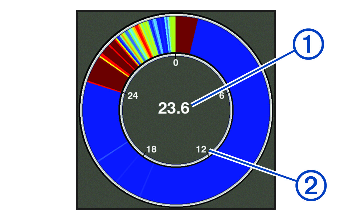 L'écran Flasheur affiche les informations du sondeur sur une échelle de profondeur circulaire indiquant ce qui se trouve sous votre bateau. Le principe est celui d'un cercle qui commence en haut et progresse dans le sens des aiguilles d'une montre. La profondeur est indiquée par l'échelle à l'intérieur du cercle. Les informations reçues par le sondeur clignotent sur le cercle lorsque lorsqu'elles correspondent à la profondeur indiquée. Les couleurs correspondent aux différentes puissances du signal.