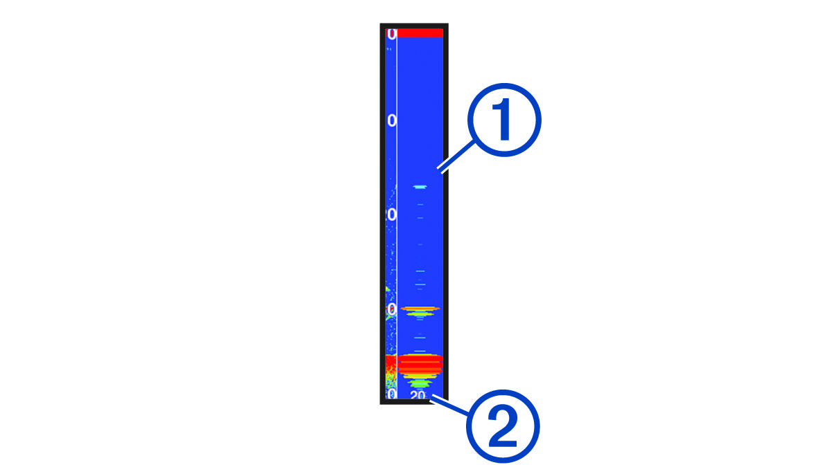 A-Scope est un flasheur vertical situé le long du bord droit de la vue plein écran du sondeur. Cette fonction développe les données du sondeur les plus récemment reçues pour améliorer leur lisibilité. Elle peut également s'avérer utile pour la détection du poisson situé à proximité du fond.