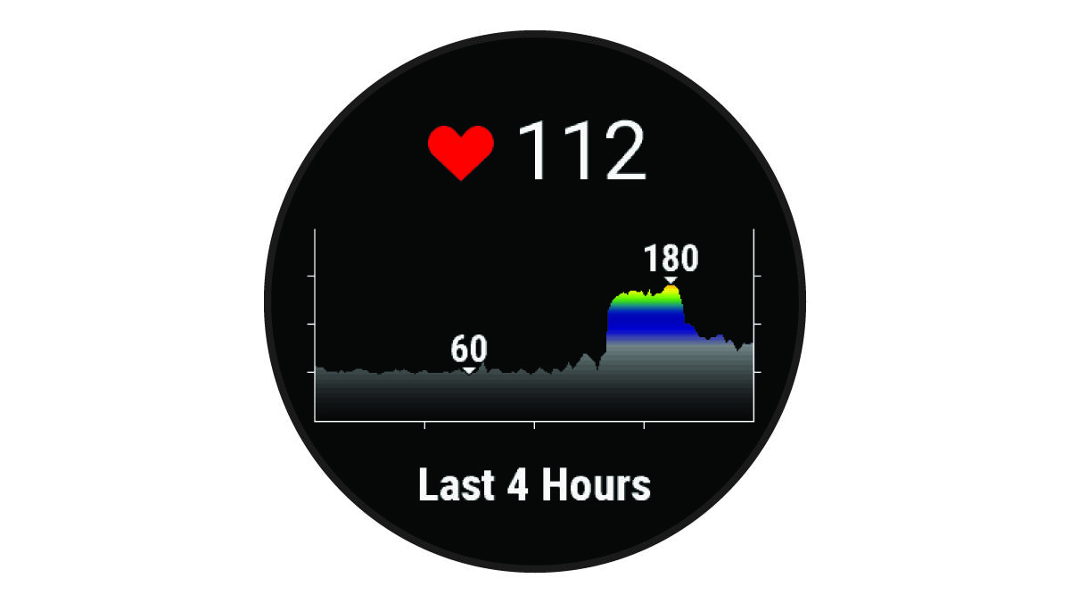 Widżet tętna wyświetla bieżące tętno w uderzeniach na minutę (bpm) oraz wykres tętna. Wykres przedstawia ostatnią aktywność tętna, wysokie i niskie tętno, a paski w odpowiednich kolorach wskazują czas spędzony w każdej strefie tętna (Informacje o strefach tętna).