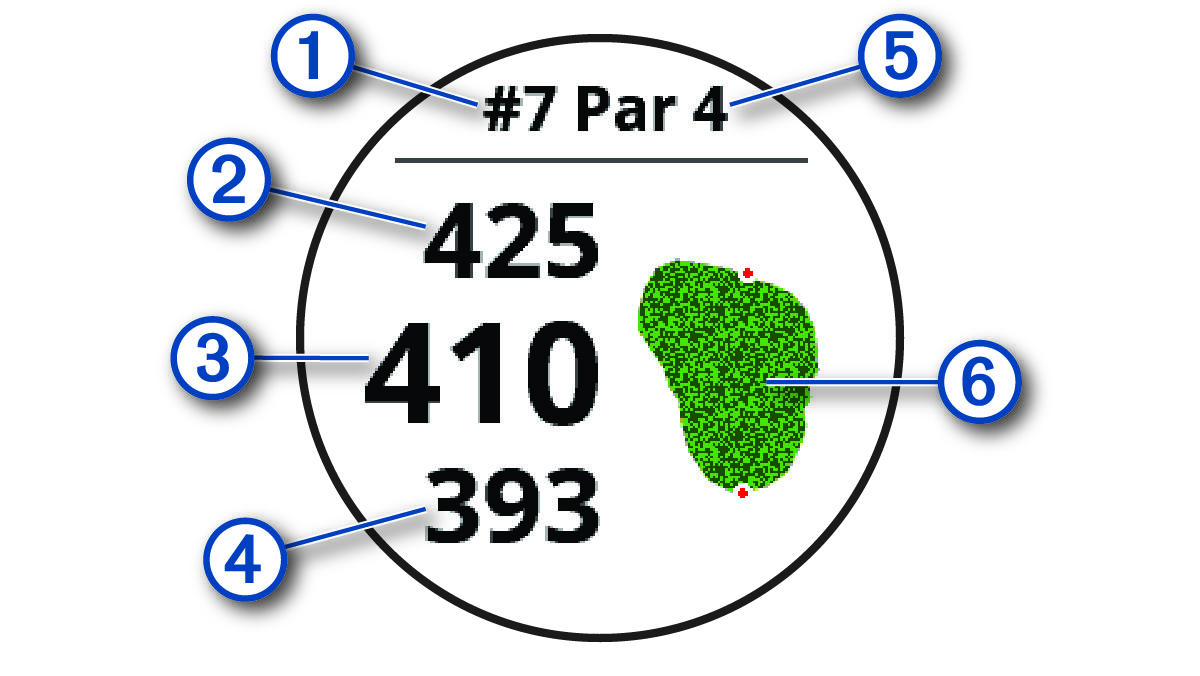 Das Gerät berechnet die Distanz zum vorderen und hinteren Bereich des Grüns sowie zur ausgewählten Position der Fahne (Ändern der Position der Fahne).