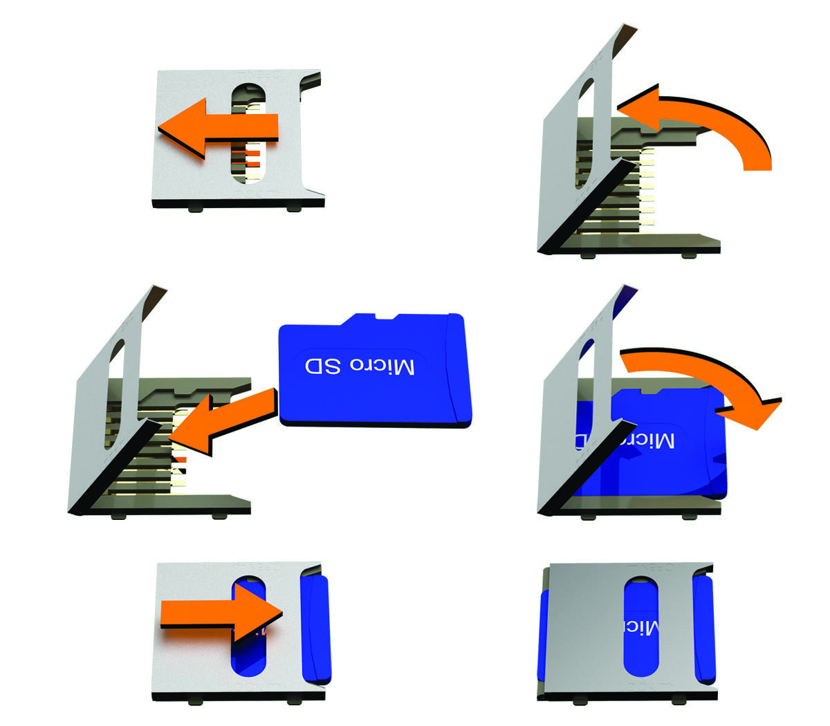 メモリカードを挿入して、デバイスの地図やその他のデータの記憶容量を増やすことができます。 メモリカードを家電量販店から購入するか、www.garmin.com/mapsにアクセスしてGarmin®地図ソフトウェアがあらかじめロードされているメモリカードを購入できます。 このデバイスは、4~64 GBのmicroSD®メモリーカードに対応しています。