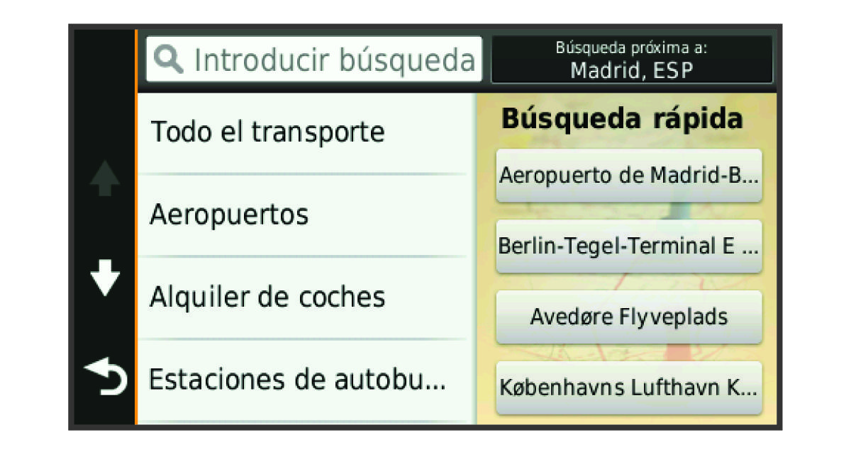 Después de buscar un punto de interés, algunas categorías pueden mostrar una lista de búsqueda rápida que incluye los últimos cuatro destinos seleccionados.